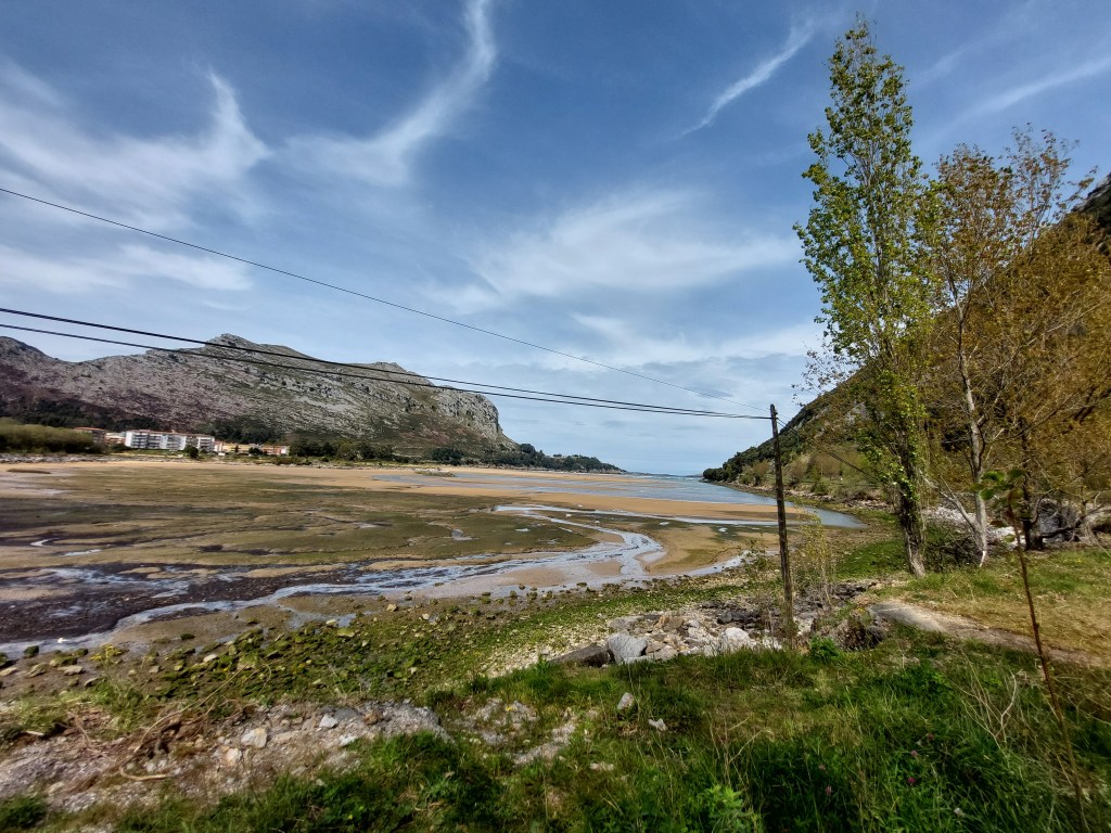 Aankomst Islares. Daar volgt de route de monding van een rivier. Ook hier weer een wild estuarium waarbij water ongehinderd naar zee vloeit. Een paar surfers oefenden op de veel te kleine golven. Hard surfen was moeilijk.