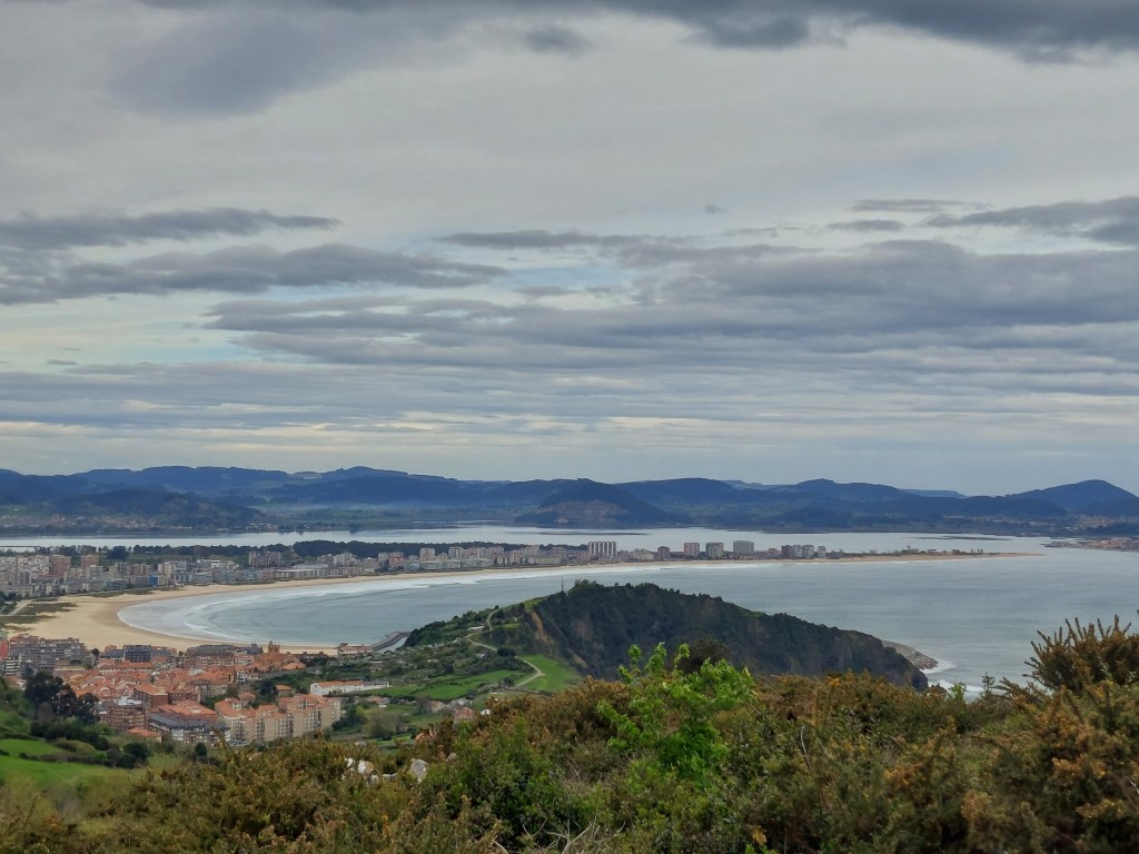 Het wandelpad, of wat er moet voor doorgaan verandert van richting en gaat ook langzaam naar beneden. En plots opent zich het zicht op de baai, op de zandstranden van Laredo, de bestemming voor de middag. Daar wacht de veerboot.