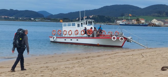 Na 5 a 6 km wandeldijk kwamen we op het einde van het zanderige schiereiland. We hadden geluk. De overzetboot was er juist om 4 jonge pelgrims, ook Duitsers bleek, mee te nemen.
