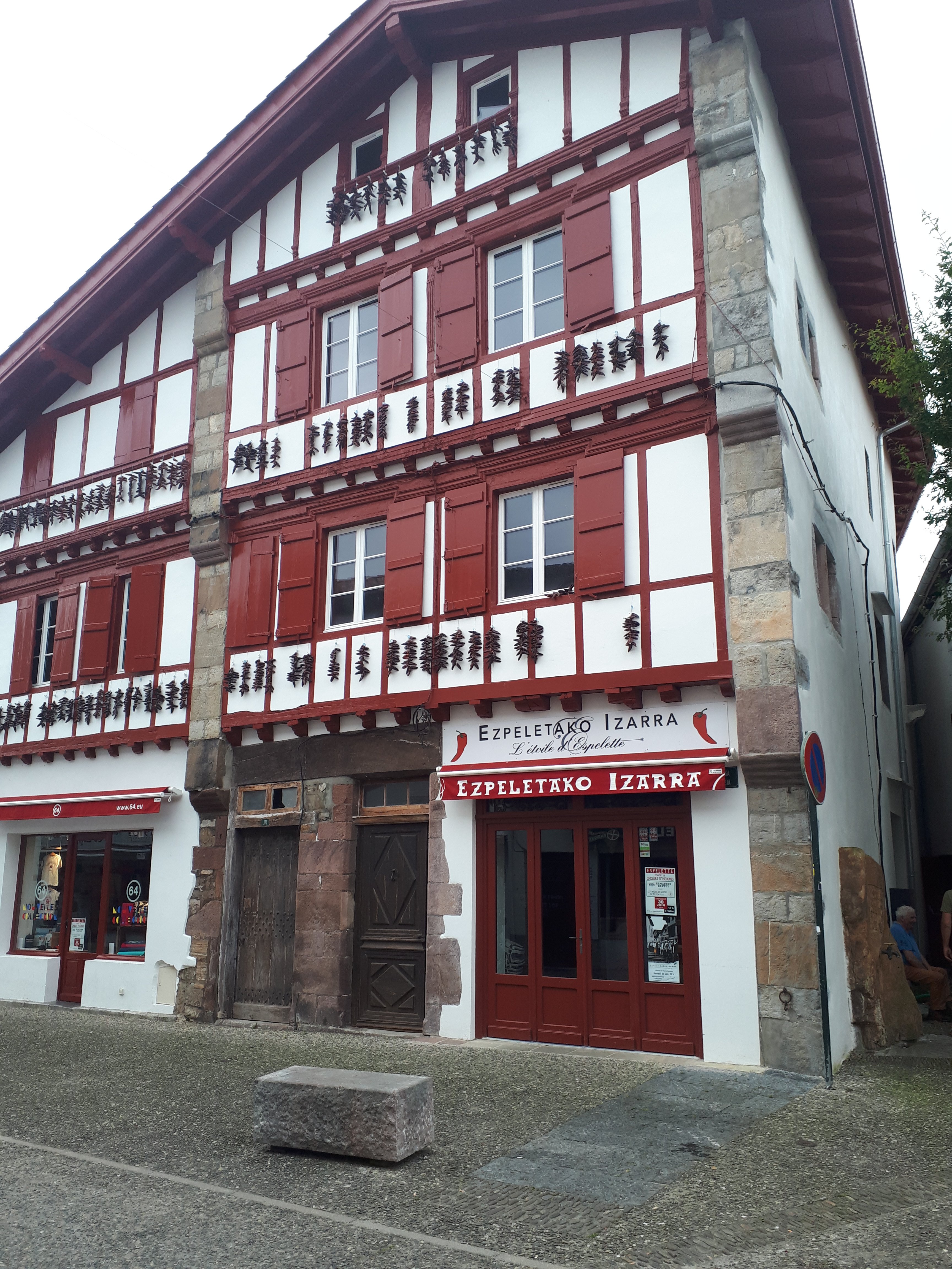 De tocht door de lage Pyreneeën naar de kust loopt verder. Bij het verlaten nog een foto van Espelette, bekend voor “le piment”. Die piment zie je hangen aan de gevel.