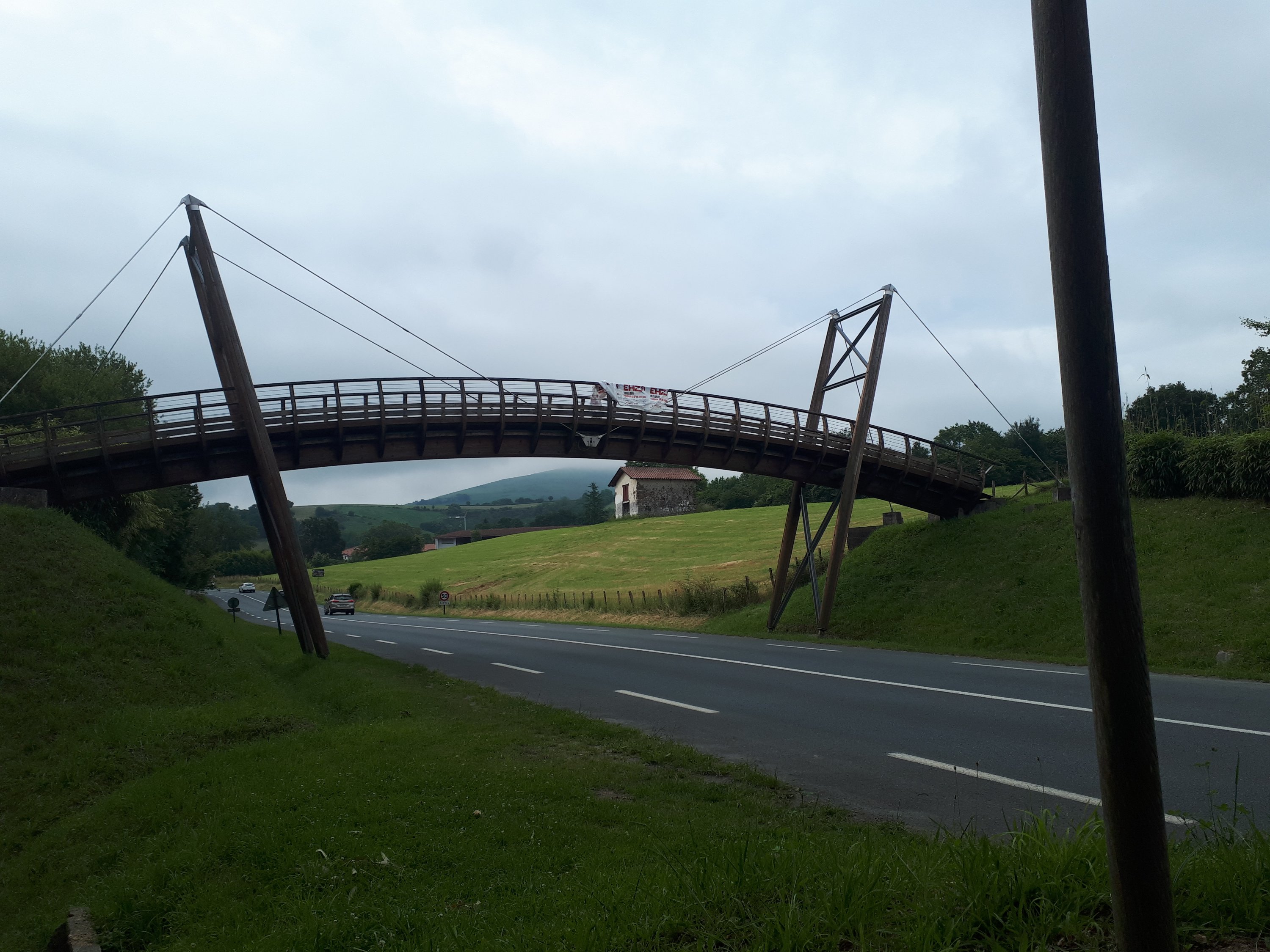 Meteen daarna slingerde het pad zich weer omhoog richting een hangbrug, die over de ringweg van Espelette hangt om de voetgangers veilig aan de overkant te leiden.