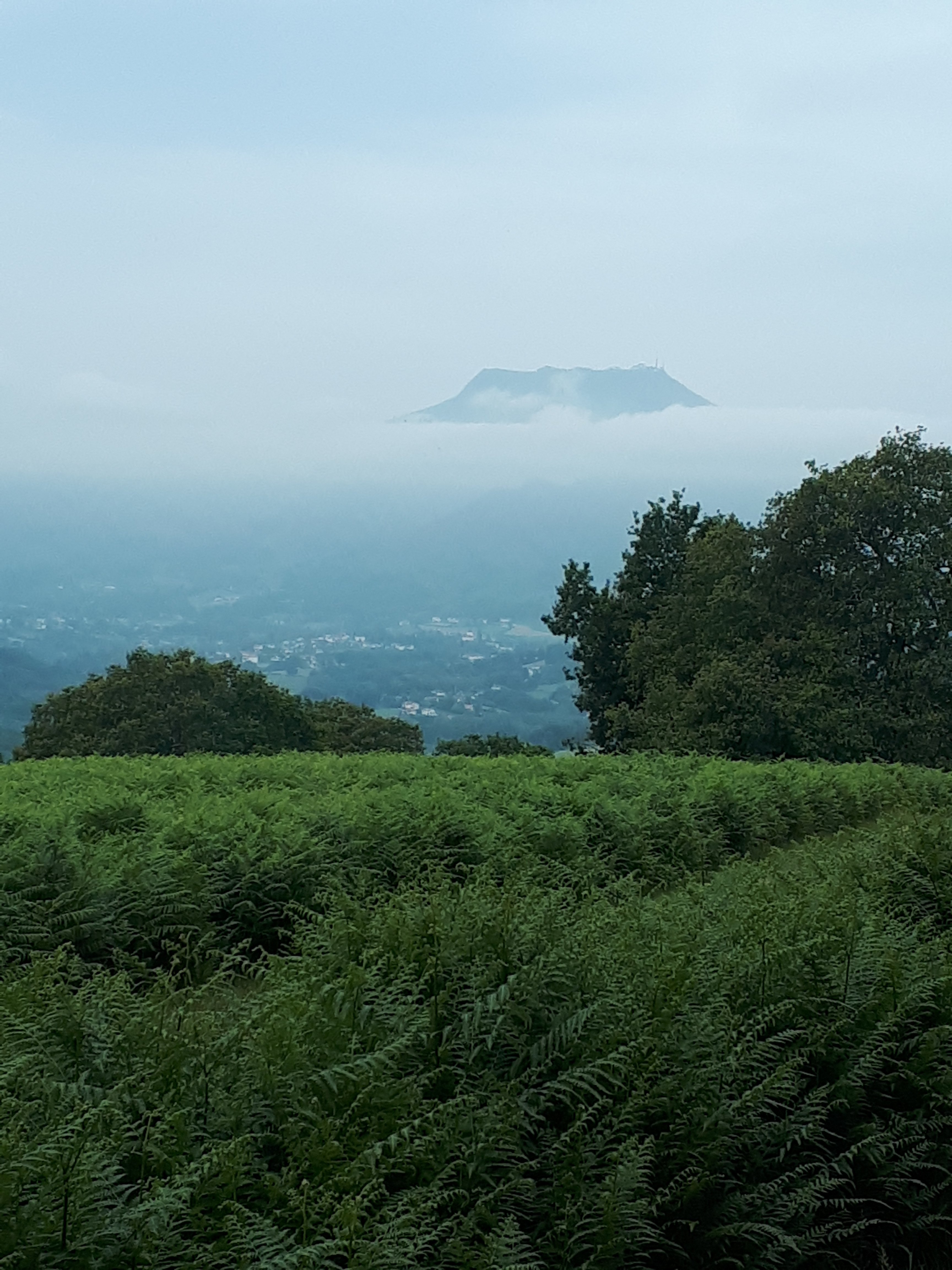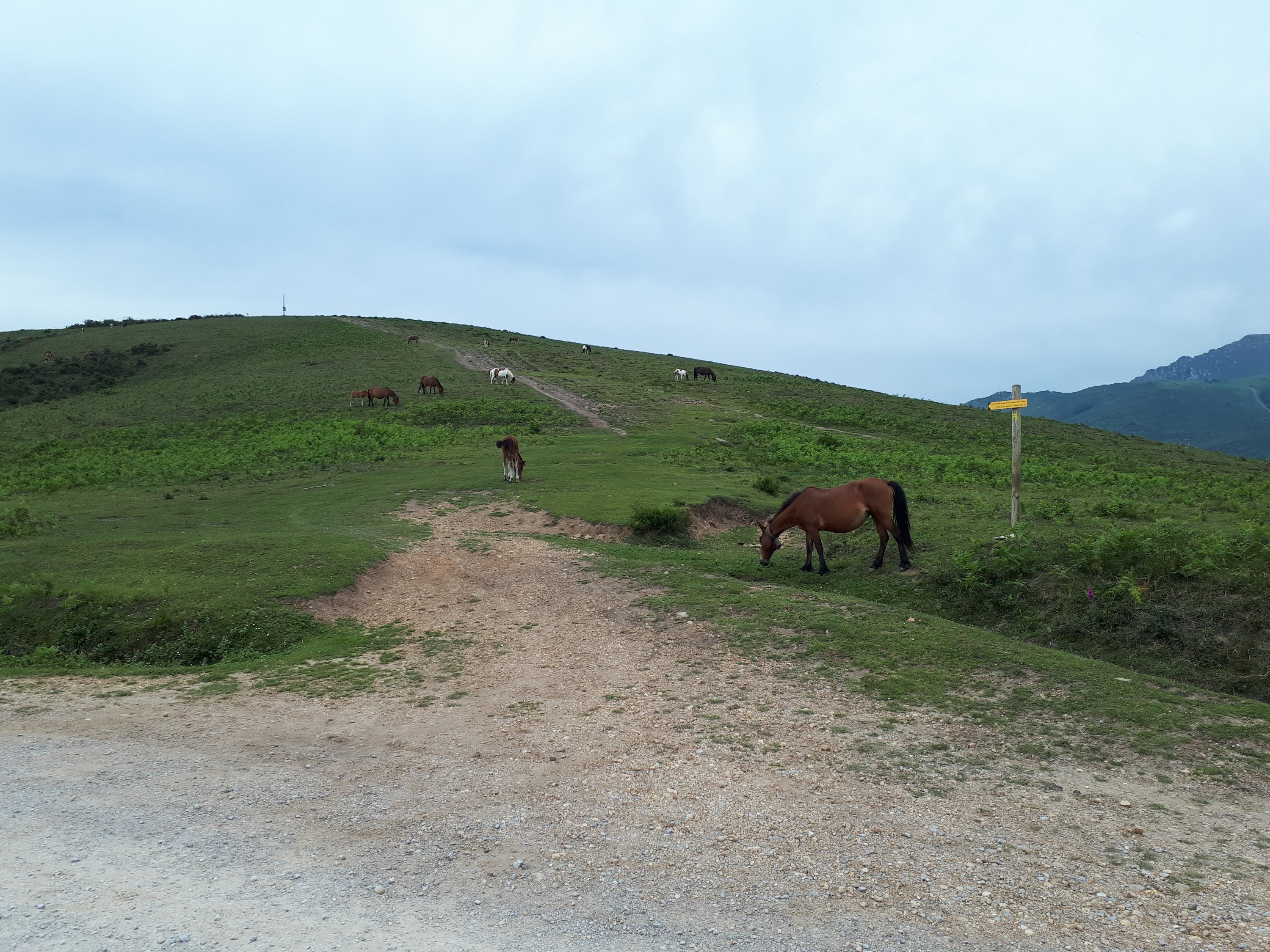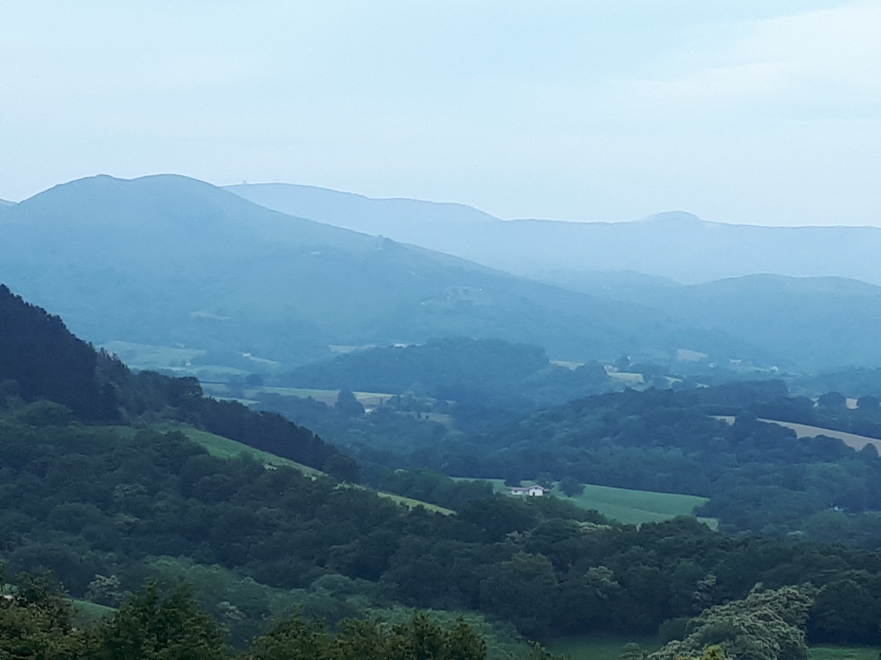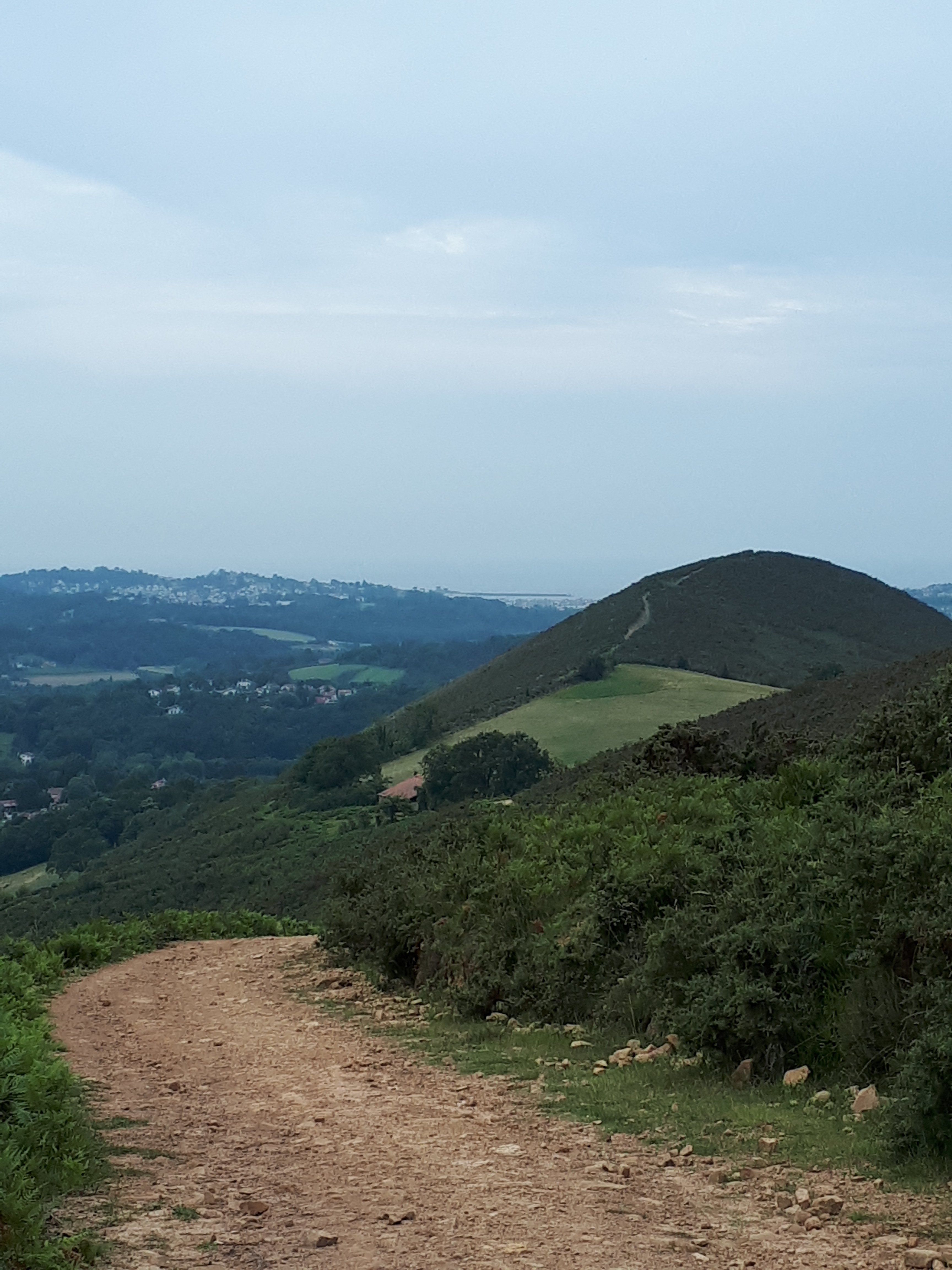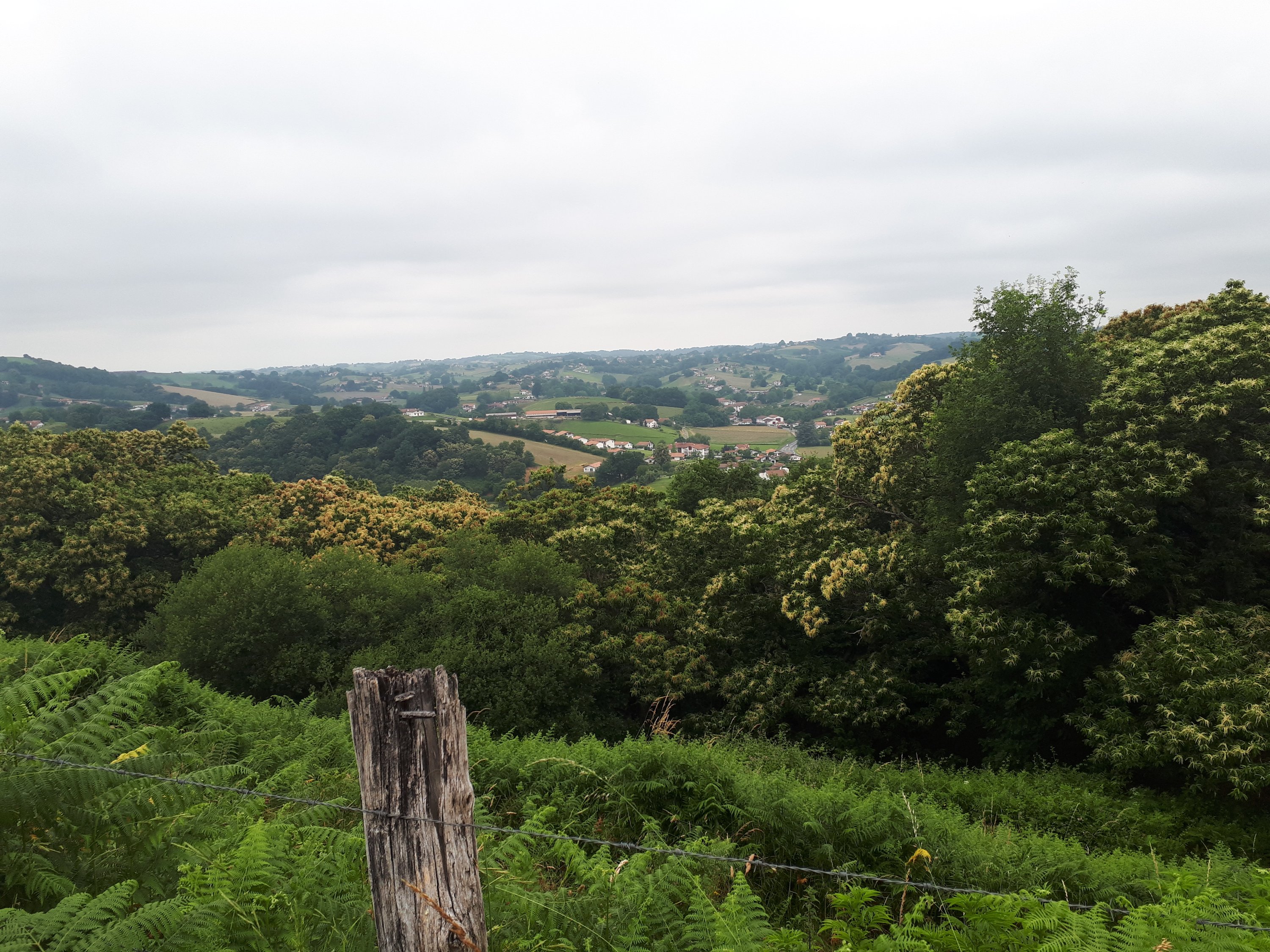 En die Camino Bidasoa loopt verder richting een heuvelkam waarover ik deze voormiddag zal lopen. De weg erheen is een flinke klim, maar eenmaal boven is er weinig niveauverschil en loopt het vrij vlot. Rechts van het pad vallen de kruinen van vele tamme kastanjebomen op. Er zijn er hier massa’s van, van deze tamme kastanjebomen.