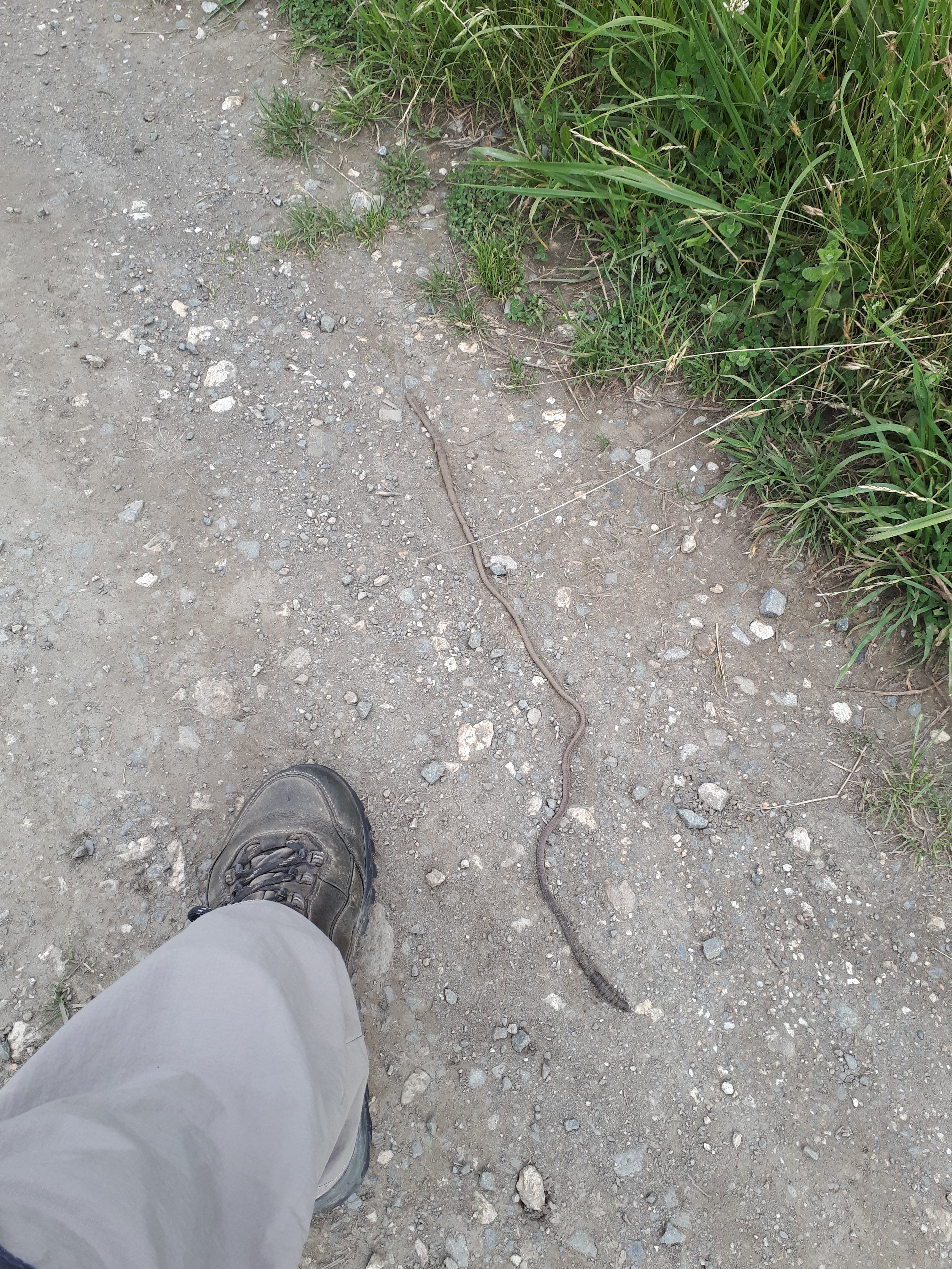 Een onverwachte ontmoeting met een regenworm. Maar geen gewone regenworm. Het kruipend exemplaar was een kleine halve meter lang! Jawel, bijna 50 cm! Voor de vergelijking heb ik er mijn voet naast geplaatst.