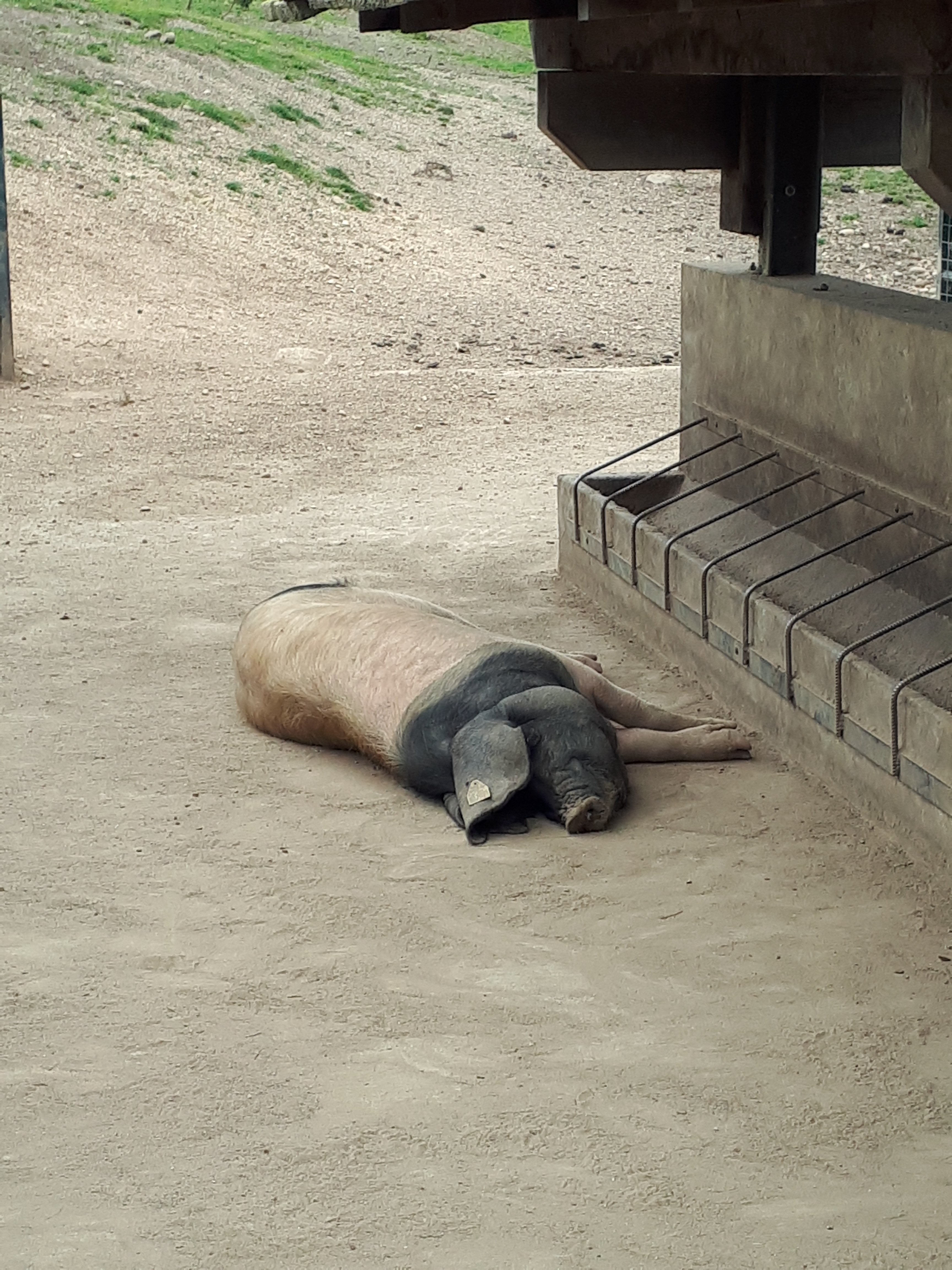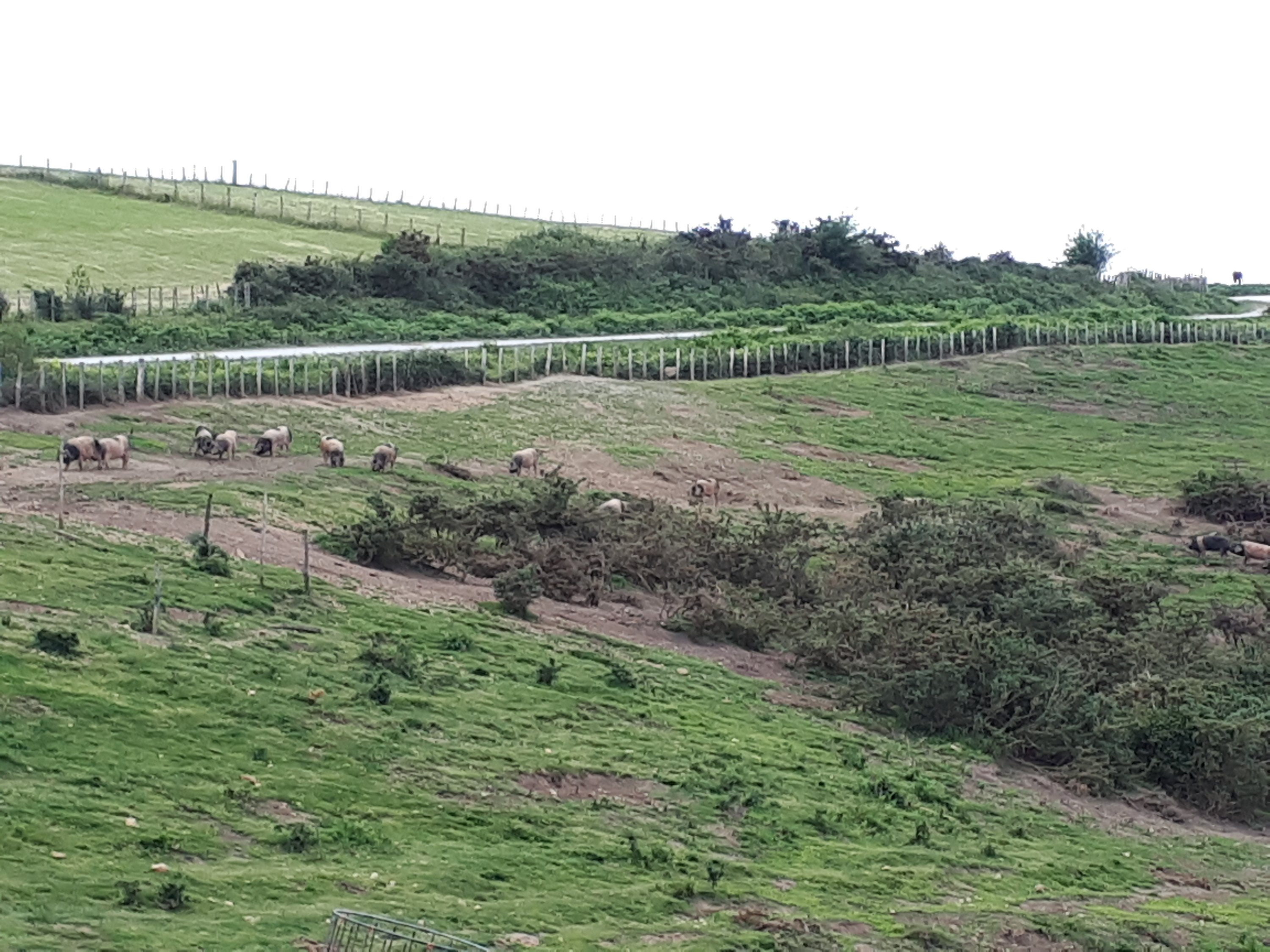 Deze foto werd op de top van de heuvel genomen. De paarden zelf lopen vrij rond maar zijn vrij mak. Wat verderop een ontmoeting met andere beestjes. Varkens, ook rondlopend op een wei. Dit exemplaar was er heel moe van.